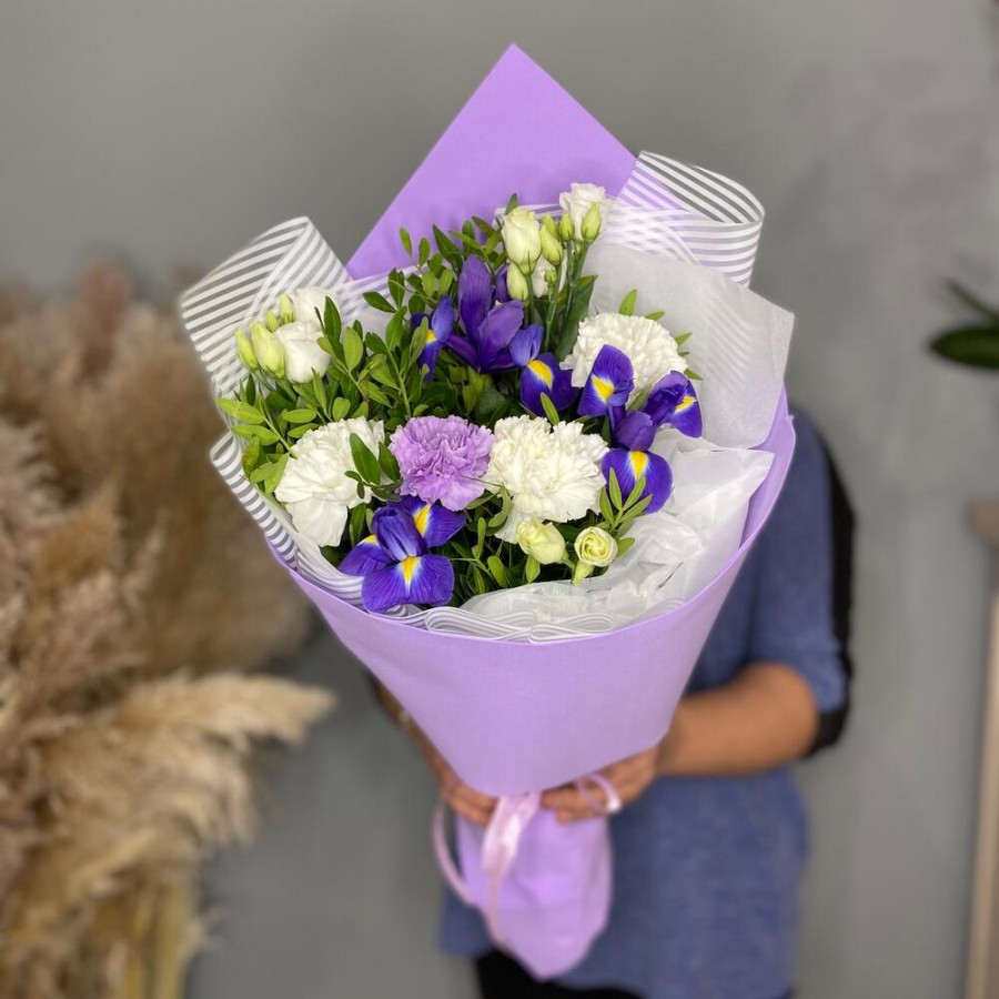 На фото букет ирисов «c днем рождения». В составе: ирис 3 шт, гвоздика 4 шт, эустома (лизиантус) 1 шт, писташ 3 шт, дизайнерская упаковка 2 шт, атласная лента 1 шт, . Все цветы свежие и ароматные, букет красиво оформлен и отлично подходит для подарка. Доступна доставка цветов или самовывоз.