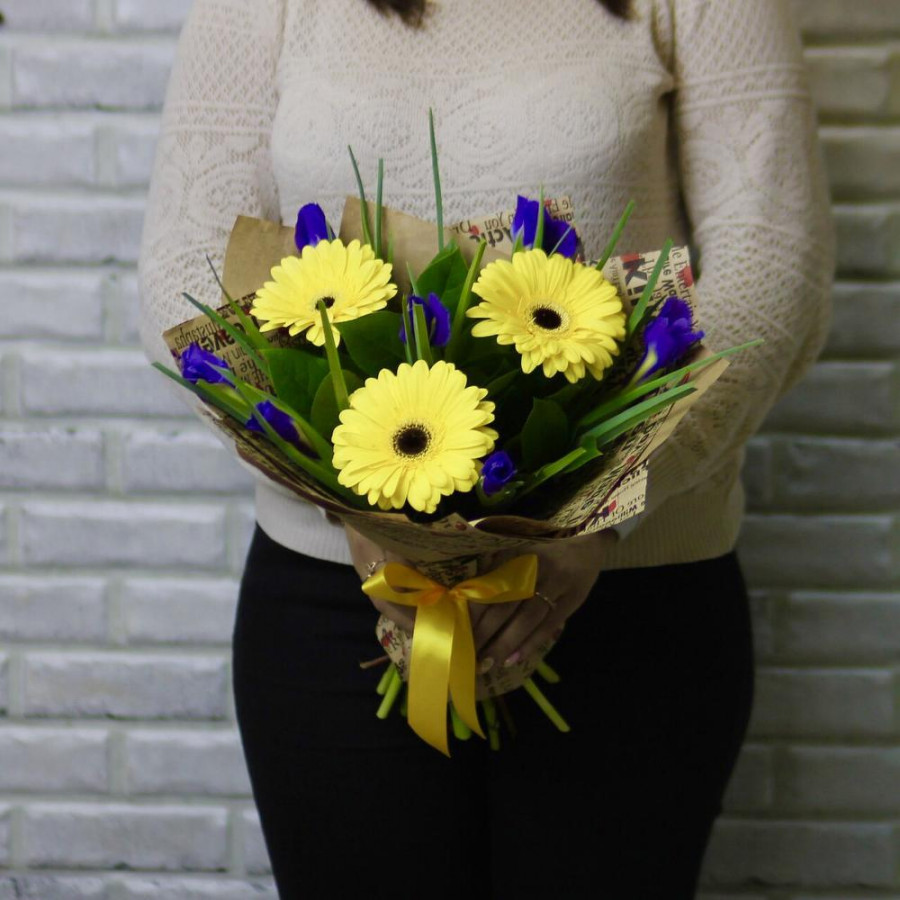 Букет из желтых гербер с синими ирисами в Нижневартовске