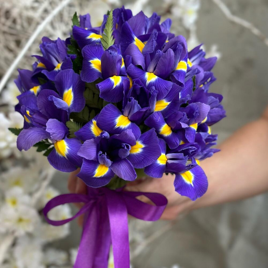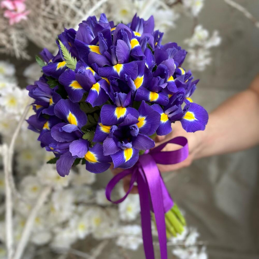 На фото свадебный букет из синих ирисов. В составе: ирис 31 шт, атласная лента 2 шт, . Все цветы свежие и ароматные, букет красиво оформлен и отлично подходит для подарка. Доступна доставка цветов или самовывоз.